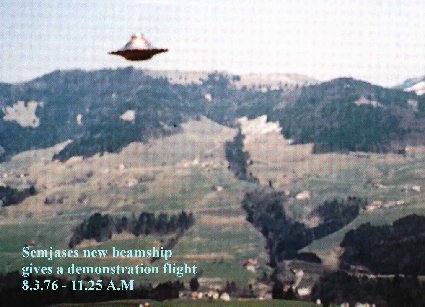 bildet t.v. viser kunstneren Nichols oppfattelse av møtet med Semjases skip - mens bildet til høyre er et av de mange fotografier som Meier tok midt på 70-tallet av skipene og som er gransket i flere bøker/fora.