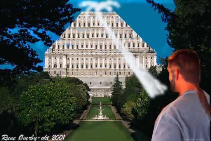 Vi kom så inn i en ganske stor farkost - først inn i et rundt rom - vi gikk ut der og inn i en korridor og et stykke bort der gikk vi "inn gjennom veggen" som tilsynelatende åpnet og lukket seg. Der kom vi inn i et stort rom med møbler av samme materiale som gulv og tak. Romme var metallisk men møblene var mørkere. Bord og langs veggen en benk og vinduer. Han ba meg vente der - skulle hente meg senere - det var bare meg der i det rommet. Jeg gikk bort til benken og satte meg på kne og tittet ut - og jeg tror at astronautene ville blitt misunnelige….Det var ikke mørke og svart - men en masse farger - som vi også har sett gjennom bilder fra Hubbleteleskopet. Mannen kom snart tilbake og hadde med seg klær til meg - maken til de han selv bar. Han ba meg ta dem på. En overall - eller kjeledress - men slik at du går inn i kjeledressen og så gjør kjeledressen resten (av påkledningen-) selv. Passer som den var skreddersydd etter mål - intelligent materiale - gråaktig farge. Vi gikk så ut i korridoren igjen og da vi kom til enden så vi et lys som brummet. Brrrm, Brrrm, Brrrm…så ut som et rullende fortau av (med) lys - summer litt. Altså et bånd av lys i en lyskorridor. Han forklarte at skipet vi var i skulle over til et moderskip - vi skulle sluses over med lys sa han. Kan ikke gå i detaljer med det her. Da vi gikk inn i det lyset var det som vi sto stille - alt rundt oss beveget seg innmari fort…og plutselig stoppet alt opp. Vi kom inn i en svær hall - en ankomsthall - der gulvet var som belagt med sten - jeg er hobbygeolog - en sten som heter black norwegian. En svart opal med farger inn i seg - dette var inne i gulvet i hallen. Når jeg trådde på gulvet var liksom ikke bena helt nede…som en magnetisme som holdt deg på en pute oppe på det. Noen centimeter over gulvet, så når du gikk så fløt du liksom. Om du normalt skulle bruke et kvarter å gå gjennom hallen så "fløt" du ganske fort over. Når du kom i andre enden var det en stor åpning ut mot et parkområde. Et skråplan fra nivået og ned i trapper som trappepyramider. Masse vannfontener og mye grønt - men trærne hadde hvite stammer. Lufta var veldig behagelig å puste i… Skipet var kjempestort - kanskje som hele østlandsområdet (men han sier at han ikke vist hvor stort det var). Det var kjempestore hus der - de største jeg har sett - utseende som pyramider med avkappede topper. Vi gikk - fløt - bortover veien, men her var veien hvit - så ut som hvit grus. Men det var ikke grus, for det lagde ikke lyd da vi gikk eller fløt… Jeg ble så bedt om å stå foran denne bygningen - med hendene og bena fra hverandre og med ansiktet mot bygningen. Han gikk litt vekk og det begynte å summe i bygningen og plutselig kom det et lys rett opp på toppen av bygningen som brettet seg ut - som en påfugl som bretter ut halen med fjæra. Lys med masse farger og mellom dette et hvitt sterkt lys som sakte kom imot meg, og traff meg midt i brystet. På det tidspunkt var jeg et flatt batteri….som ble ladet opp igjen.