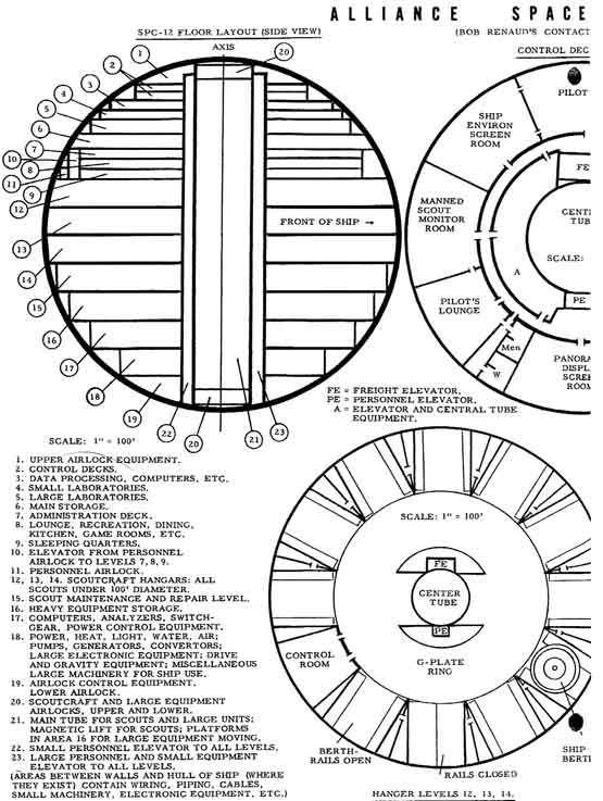 They rose to a kind of carrier-ship with a tubular hangar inside with a hundred feet (30m)in diameter and (later told) 550 feet (16,5km) in length! A good sized tubular scout carrier could be parked in that great shaft!