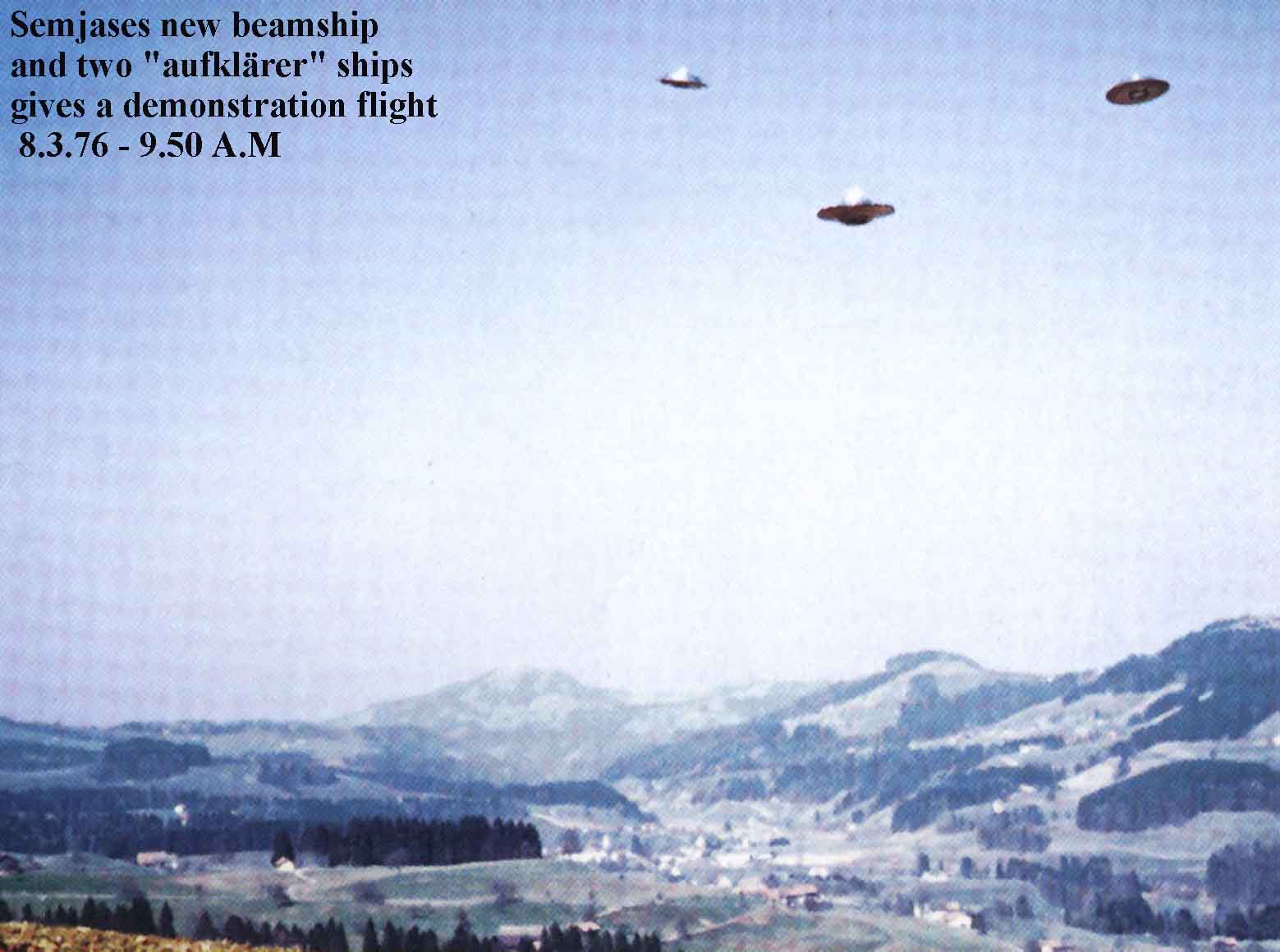 It was Meier' 5 eighteenth close-up observation of extraterrestrial spacecraft when at 02:00 in the early morning hours of 3 February 1965, he was summoned to a place which had only shortly before that been made known to him telepathically. It was severely cold when he left his residence and started that walk in the dark to a favorite place of his where he had often gone alone for many hours. Just sixteen days before that he had been told that this would be the place for the contact on the day, a time then still to be fixed, and it was now conf irmed as the contact point. Though clattering cold, he began to sweat as he climbed briskly up a little hill to the agreed upon site.