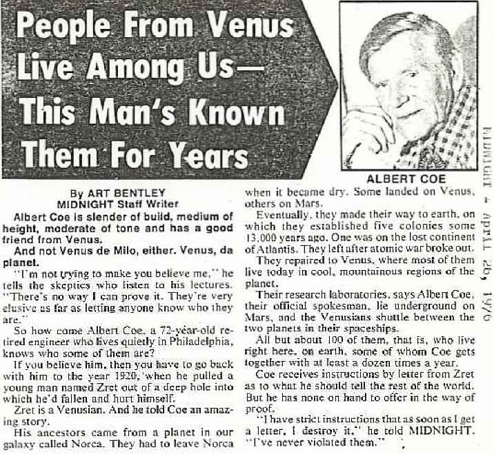 Story of a Venusian incarnation;  | Albert Coe s ufocontact VENUSIANS WALK OUR STREETS. By Paul M. Vest 1954 in MYSTIC MAGAZINE