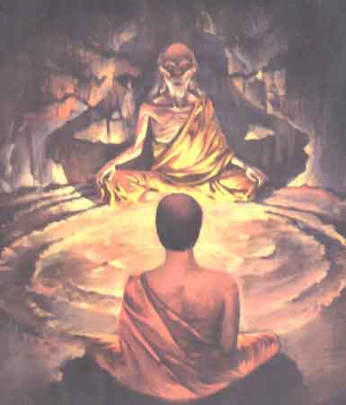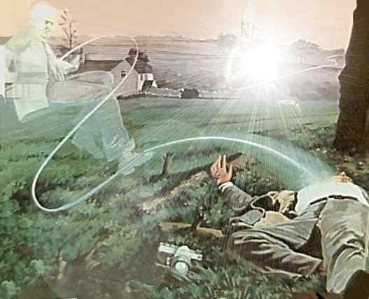 artpicture of the "walk-in coupling" where the astral helpers disconnected the original body-captain - here left - and connected the initiaded Tibetan; Rampa, (the radiate beeing) after the earlier agreement about this was made. More details in THE RAMPA STORY | full inWord | pdf | and in AS IT WAS | pdf | overview of full books