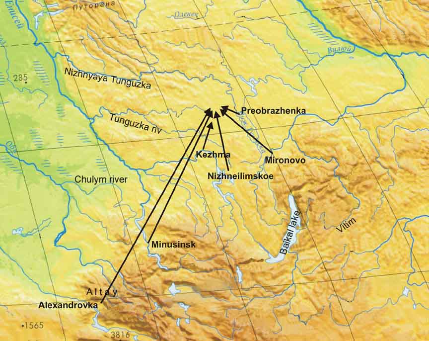 At that same time, the flight of a heavenly body was observed in the south of the Krasnoyarsk territory, 60 km north of Minusinsk, 930 km from the site of the explosion, but moving along a different trajectory. Roughly at the same time, an object was seen in the region of the Nizhneye-Ilimskoye settlement, 418 km from the explosion site. And then, it has been reliably established, a heavenly body flew over the village of Preobrazhenka, which is on the Nizhniaya (Lower) Tunguska River. And all these objects were flying in the same direction—towards one destination: the Shishkov and Kulik blast areas and Voronov's crater!